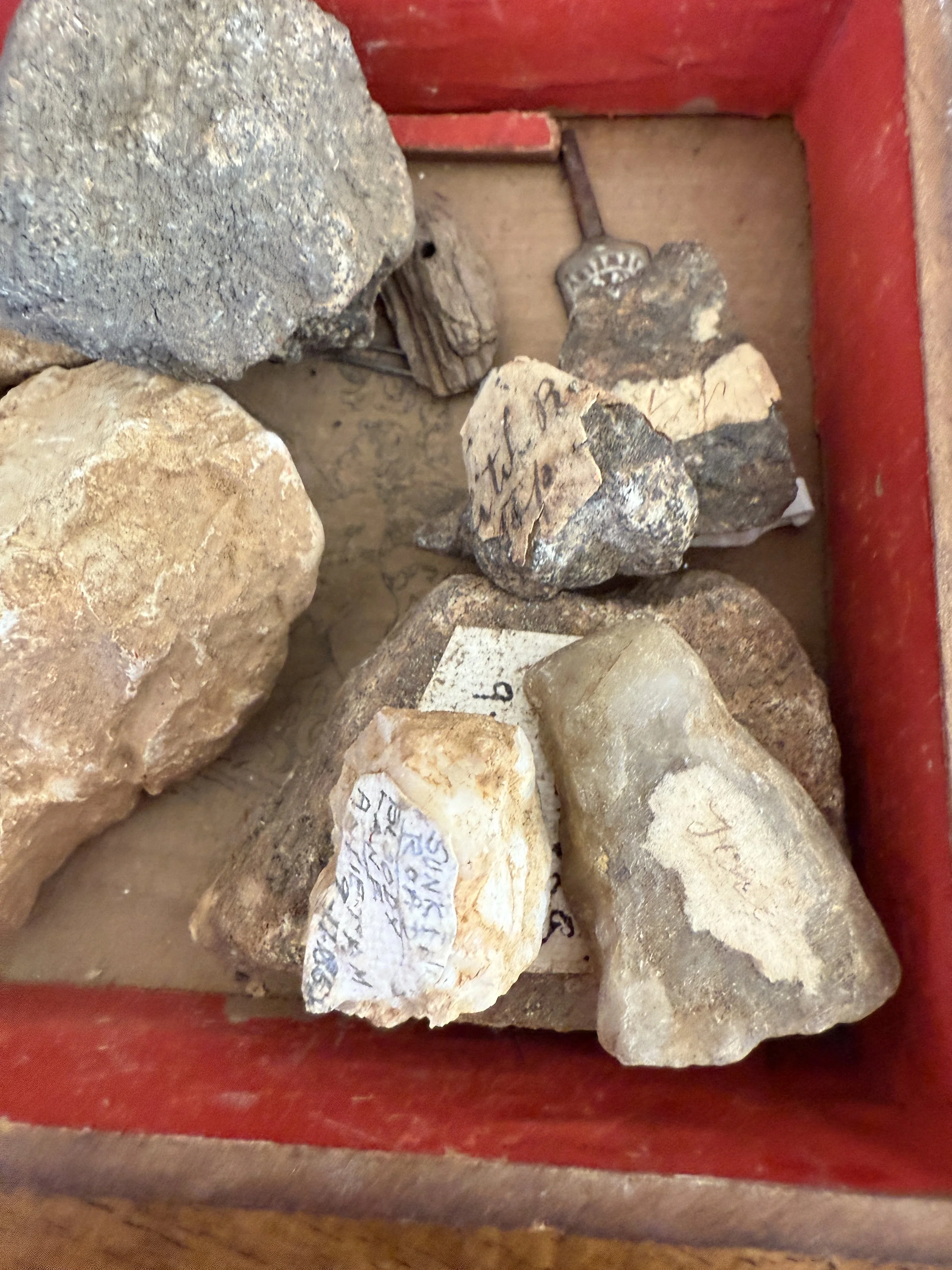I found a rough wooden box with a cracked lid, full of rocks. Each rock has a piece of cloth secured to it with what looks like wheat paste. The cursive is elaborate, but legible: Gettysburg. Antietam. Shiloh. Battle names from the American Civil War, with dates.