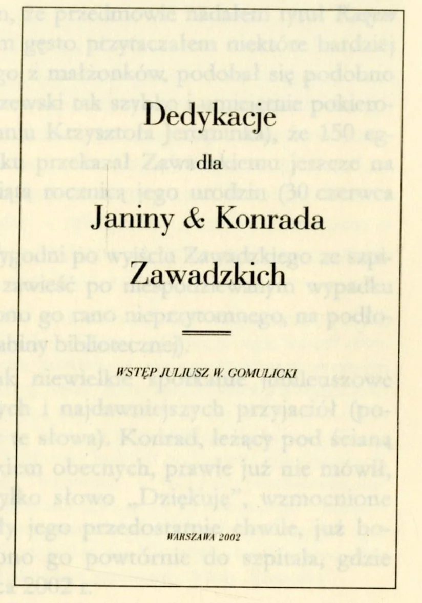Gomulicki dedicated a book in the collection "To Mrs. Janina Zawadzka, who reads poetry," and apologized for "keeping Konrad waiting, who is tearing himself away to telephone you that he is already leaving." He made similar comments on Konrad’s doting on his wife in multiple dedications, over fifty years.