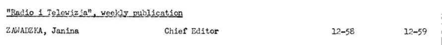 She ran the weekly publication Radio i Telewizja: Poland's main radio and television listings magazine. To the State Department, she was a Communist bloc media figure. They gave her two separate entries alongside Party functionaries.