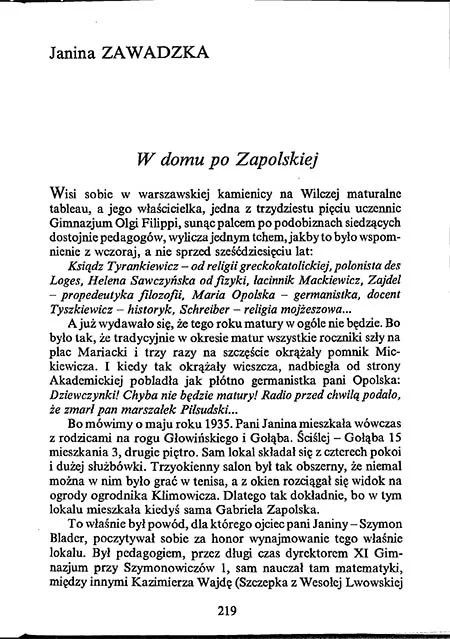 Janicki's book is the third volume of a trilogy of portraits of the Lwów diaspora: people born in Lwów who ended up in Warsaw after the war. His chapter is titled "Janina ZAWADZKA." The subtitle: W domu po Zapolskiej — "At Home After Zapolska."